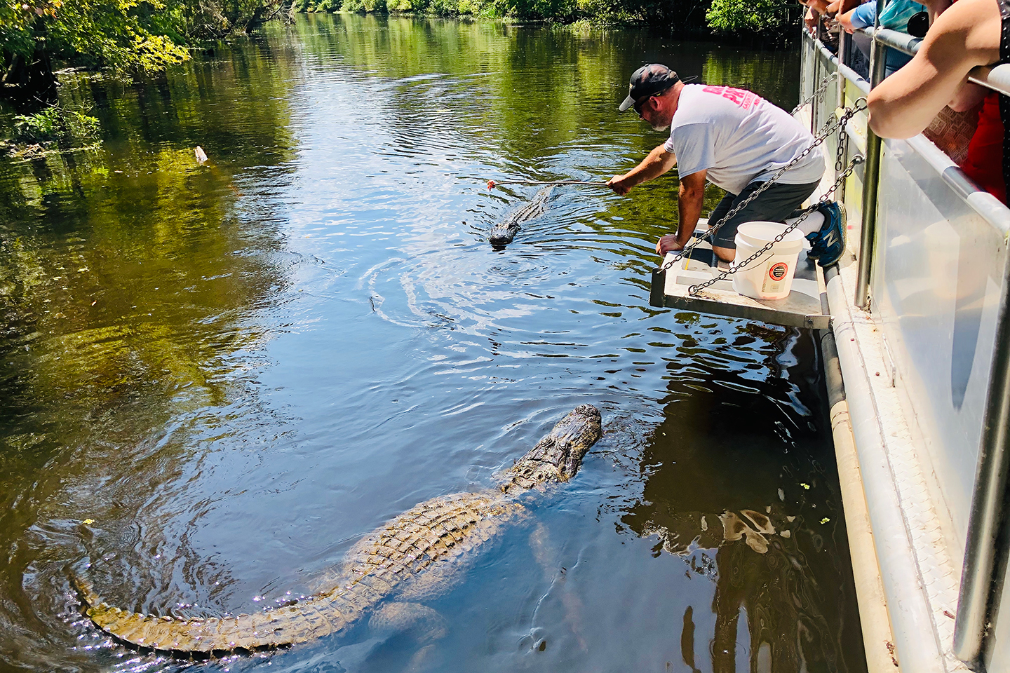 Then it’s a short ride from River Road to a privately-owned wildlife refuge within the Manchac Swamp, where homegrown Cajun captains will take you on a journey back to the early days of swamp and bayou exploration. They’ll guide the covered pontoon boat through the mystical cypress swamp while showing off the American Alligator and abundant wildlife. Learn the history of the town of Frenier and the Cajun culture of fishing, hunting, and trapping. Get the camera ready gators leaping up for a snack!